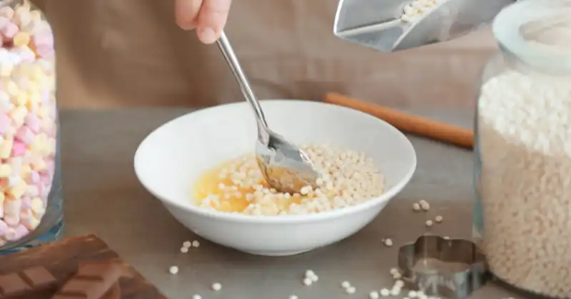 - Gradually add the puffed rice cereal to the peanut butter mixture. Stir gently to ensure that all of the grains are uniformly coated.